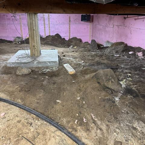 M. Boutin a un vide sanitaire qui n'est pas isolé, très humide et dont l'eau s'infiltre par les murs et le sol. Il a contacté Systèmes Sous-sol Québec pour avoir un vide sanitaire sec et renforcer les poutres de soutien qui sont en bois.